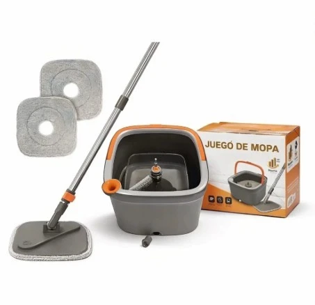 Set completo para limpieza de pisos que incluye mopa con cabezal plano, balde con sistema de autoexprimido por presión, y 2 repuestos de microfibra lavables. Mango extensible de acero inoxidable ajustable en altura. Ideal para todo tipo de superficies duras.